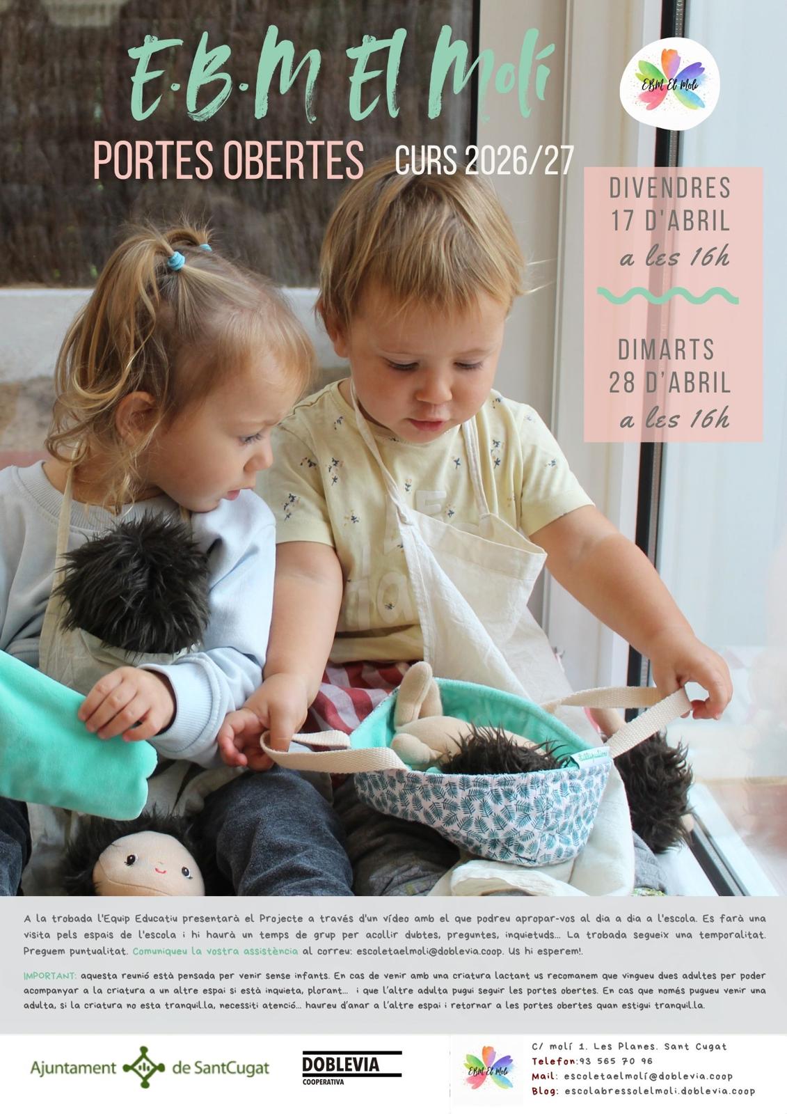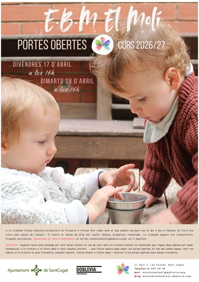 Les portes Obertes del curs 2026-27 seran: . El divendres 17 d’abril a les 16h . El dimarts 28 d’abril a les 16h A la trobada l’Equip Educatiu presentarà el Projecte i es farà una visita pels espais de l’escola i hi haurà un temps de grup per fer conversa, …